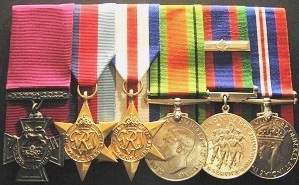 | A replica Victoria Cross and the original campaign medals are on display in the Queen's Own Rifles of Canada Museum, Toronto. |